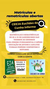 A direção do CEEJA – Euclides da Cunha de Alvorada do Oeste, avisa a todos os interessados (alunos) que as matrículas e rematrículas estará abertas até dia 31 de janeiro, nos horários de 07:30 às 13:30/hrs, para o ensino Fundamental e outros.