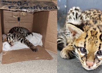 Veja vídeo: Filhote de jaguatirica é encontrado em estrada rural e entregue à delegacia de Costa Marques