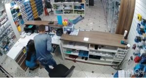 Câmera de monitoramneto registra momento em que assaltantes levam aparelhos celulares e dinheiro de loja, em Nova Mamoré