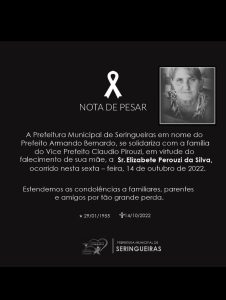 Faleceu nesta sexta-feira (14), em Seringueiras a mãe do vice-prefeito Cláudio do Maracuja, a senhora Elizabeti Pirouzi da Silva de 67 anos.