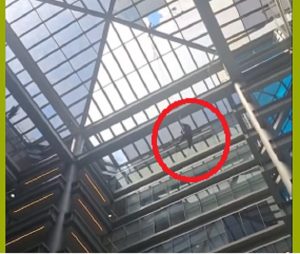 Uma gravação recebida pelo Metrópoles mostra o momento em que o trabalhador ficou pendurado na estrutura de vidro do prédio.