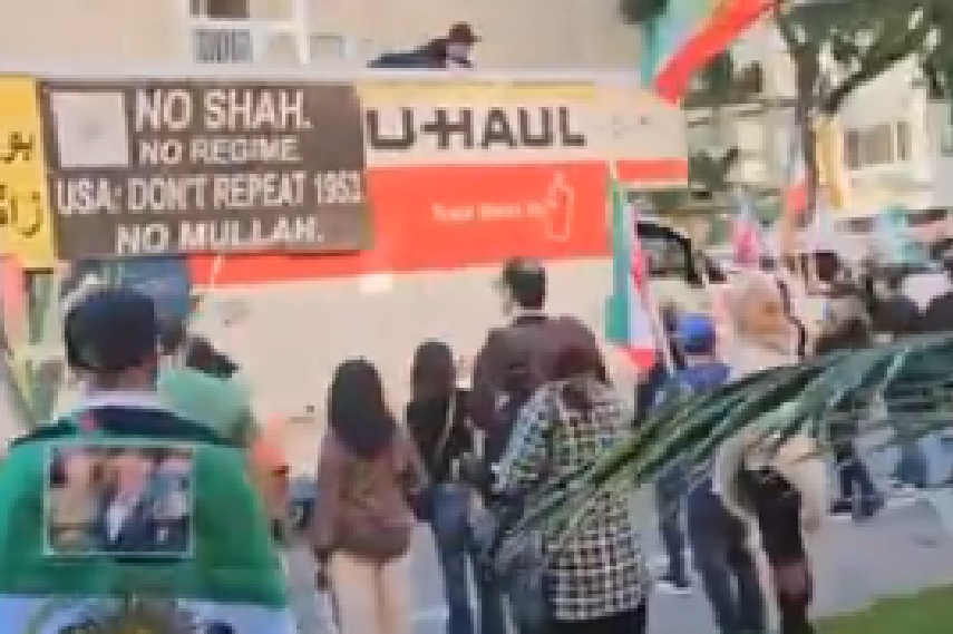 “No Shah, No Regime. USA: Don’t Repeat 1953. No Mullah” (“Sem xá, sem regime. EUA: não repitam 1953. Sem aiatolá”).