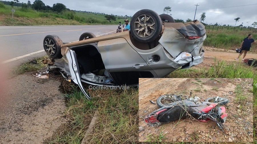 De acordo com informações preliminares, um veículo teria colidido na traseira da motocicleta. Com o impacto, o carro saiu da pista e capotou, enquanto a moto ficou destruída.